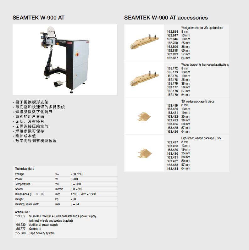 特點:無需預熱、楔塊瞬間升溫;多臂系統(tǒng),變速設計,能切換焊接寬度和速度;觸摸屏操作,控制焊接參數;界面直觀,支持快速查找參數;